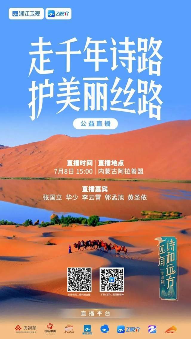 6月11日起,浙江卫视《还有诗和远方·非遗篇》开启全新的“诗远”追寻之旅,从越剧之乡嵊州出发,一路走过浙江省内多个各具古韵的地方,走向千年沙漠古城内蒙古阿拉善,试图打造辐射范围更广、传播实力更强的全国性文旅综艺新标杆。日前,《还有诗和远方·非遗篇》正于内蒙古阿拉善录制,并在旅行正式开始前开启一场以「走千年诗路,护美丽丝路」为题的公益直播,通过诗歌分享、问答互动等方式表达了对治理荒漠化、改善生态环境的美好期许,直播观看总量突破260万。