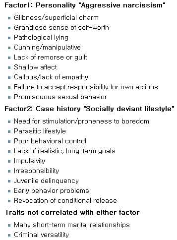 在60年代末,行为研究者在研究犯罪人在某些情景下的行为共性时,提出了一种犯罪人格模型(就像当年龙布罗梭研究了一通颅相学之后写出了《犯罪人论》讨论犯罪的人在身材相貌上跟不犯罪的人的差异一样),称之为psychopathy(暂译“精神变态”)。psychopathy现在被认为一种人格障碍,也可以说是一种负面的人格,其特点包括:自大,自恋,冷漠,狡诈,残忍,轻率,易怒,没有责任心,反社会行为等等。后来在90年代初研究者为了研究这种变态人格而制定了量表。