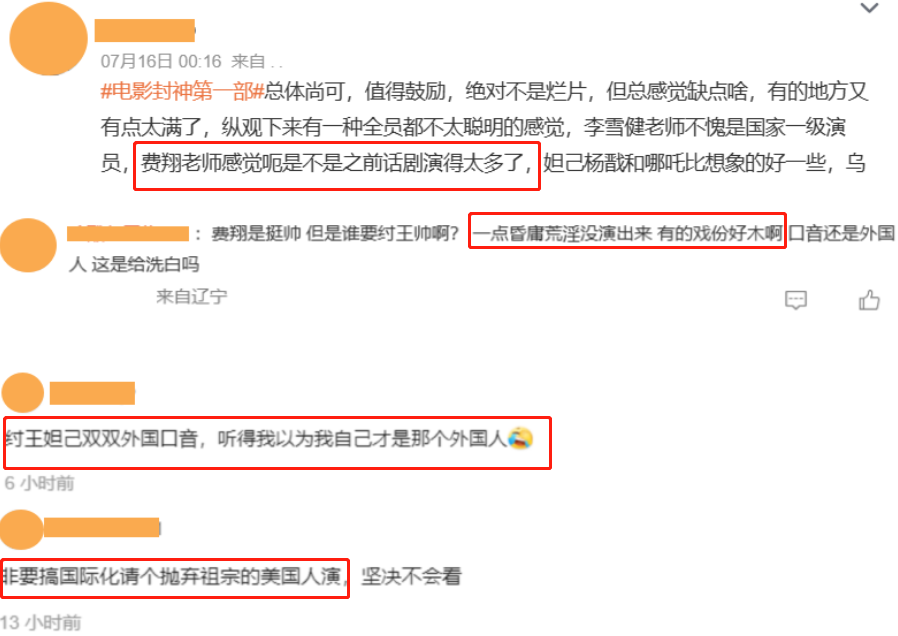 “谁要纣王帅啊,一点昏庸荒淫没演出来”、“纣王大家双双外国口音,听得我以为我才是外国人”、“费翔老师是不是之前话剧演太多了”。