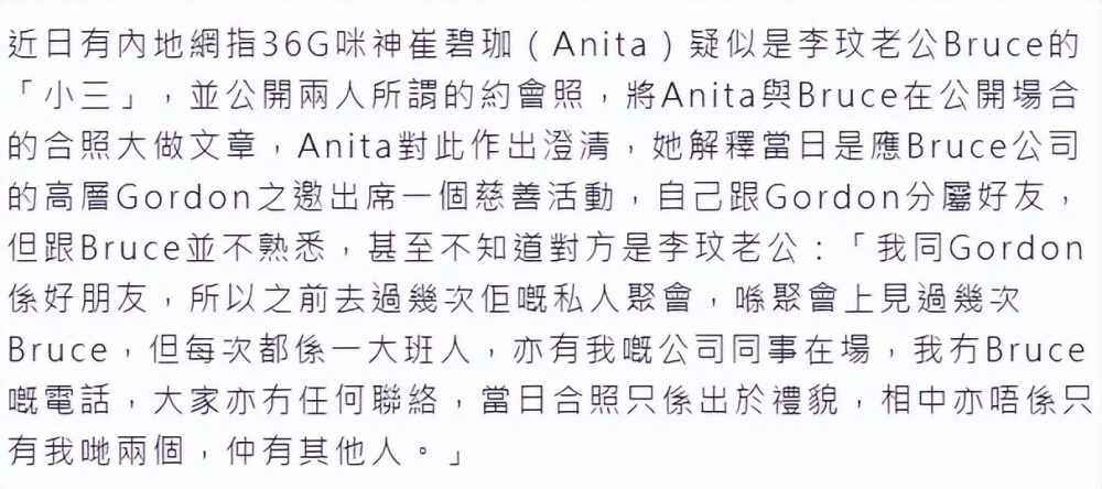 她表示,自己与李玟的丈夫Bruce仅见过几面,且每次都与一帮人一起,两人拍摄“亲密”合照,也仅是出于礼貌。