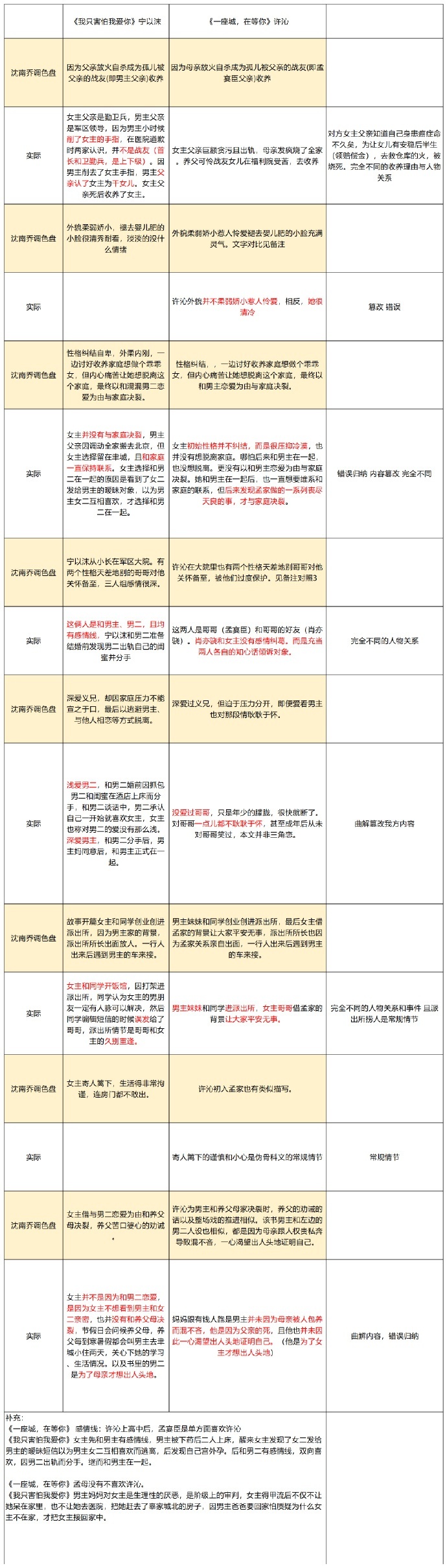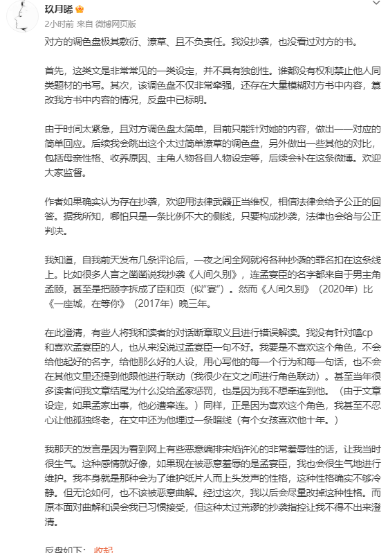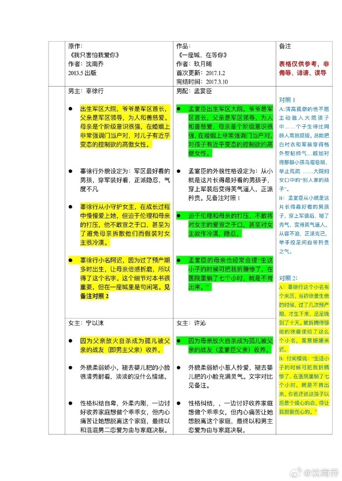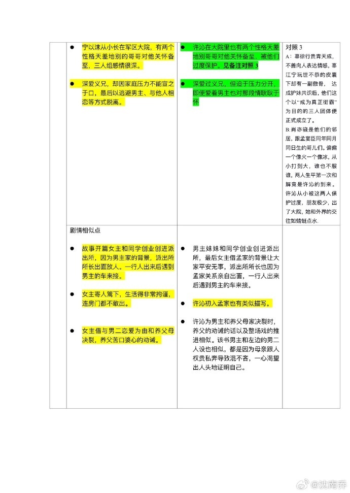 “抄袭”传闻愈演愈烈,7月17日玖月晞列表格驳斥沈南乔,称自己“没抄袭,也没看过对方的书”。