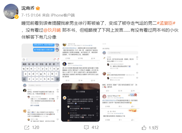 7月15日,网友沈南乔指出,有读者表示《一座城,在等你》中男二孟宴臣角色设定神似自己所写小说男主。