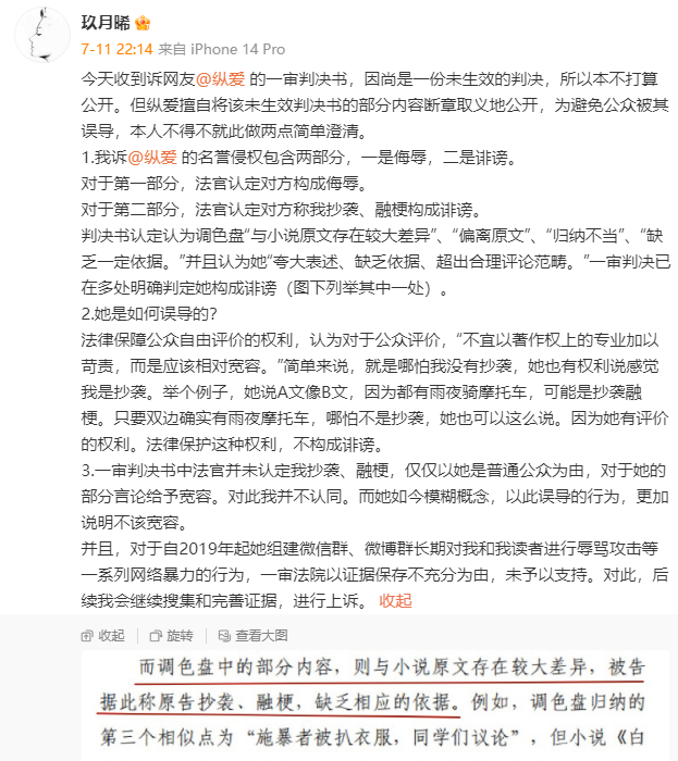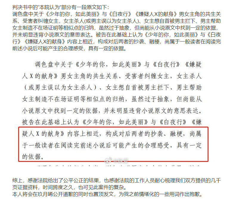 2023年7月11日,纵爱发文,晒一审判决书中部分内容,“被告在此基础上认为《少年的你,如此美丽》与《白夜行》《嫌疑人X的献身》内容上相近,构成对后两者的抄袭、融梗,尚属于一般读者在阅读完前述小说后可能产生的合理感受,具有一定的依据。”