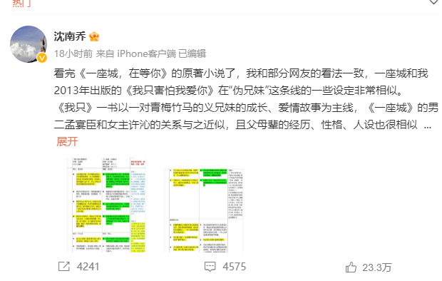 7月16日,沈南乔再发文,称《一座城,在等你》和自己2013年出版的《我只害怕我爱你》的一些设定非常相似,并罗列两本小说相似点。
