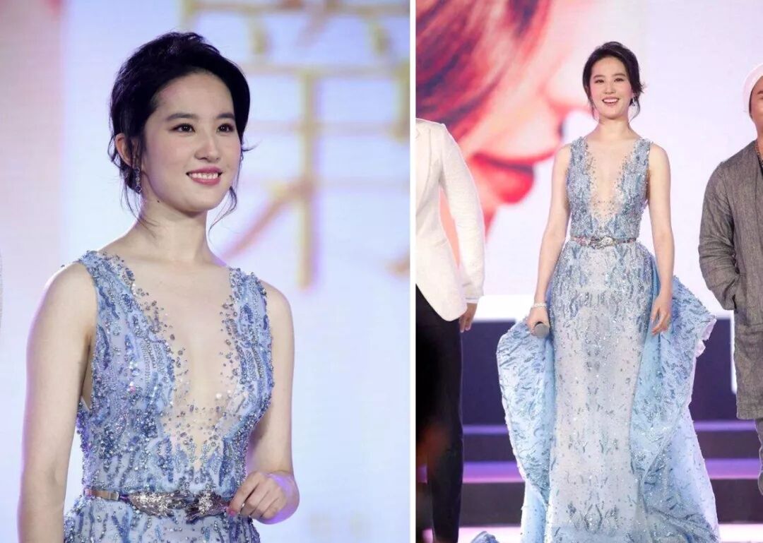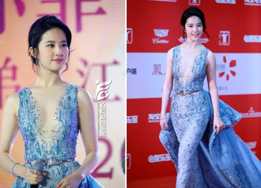 刘亦菲这款浅蓝色烫钻礼服裙,设计非常出位大胆,深V开到肚脐,露出完美胸型,惊艳全场,相当性感逼人。