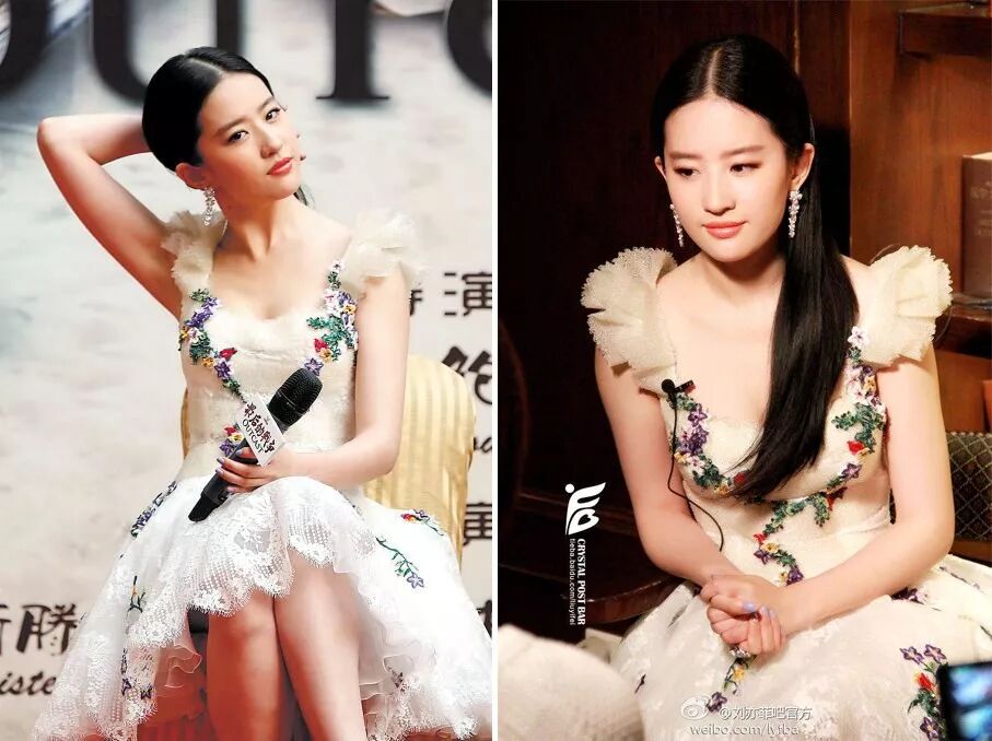 ▲ 还有一次,电影《最后的战争》发布会在北京举行,主演刘亦菲一袭低胸裙亮相,性感十足。穿着花朵装饰的白色连衣裙,低胸款式,大秀乳沟,清纯形象荡然无存。