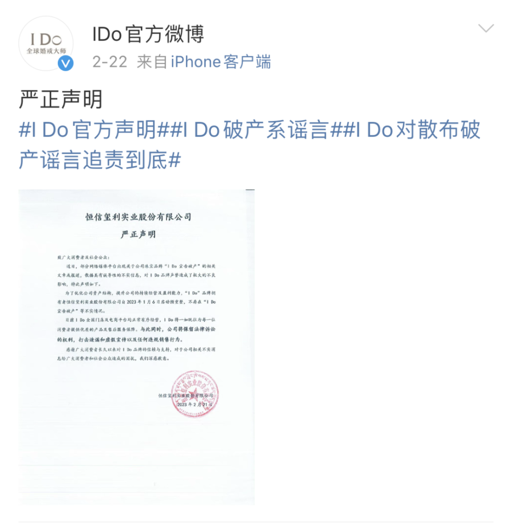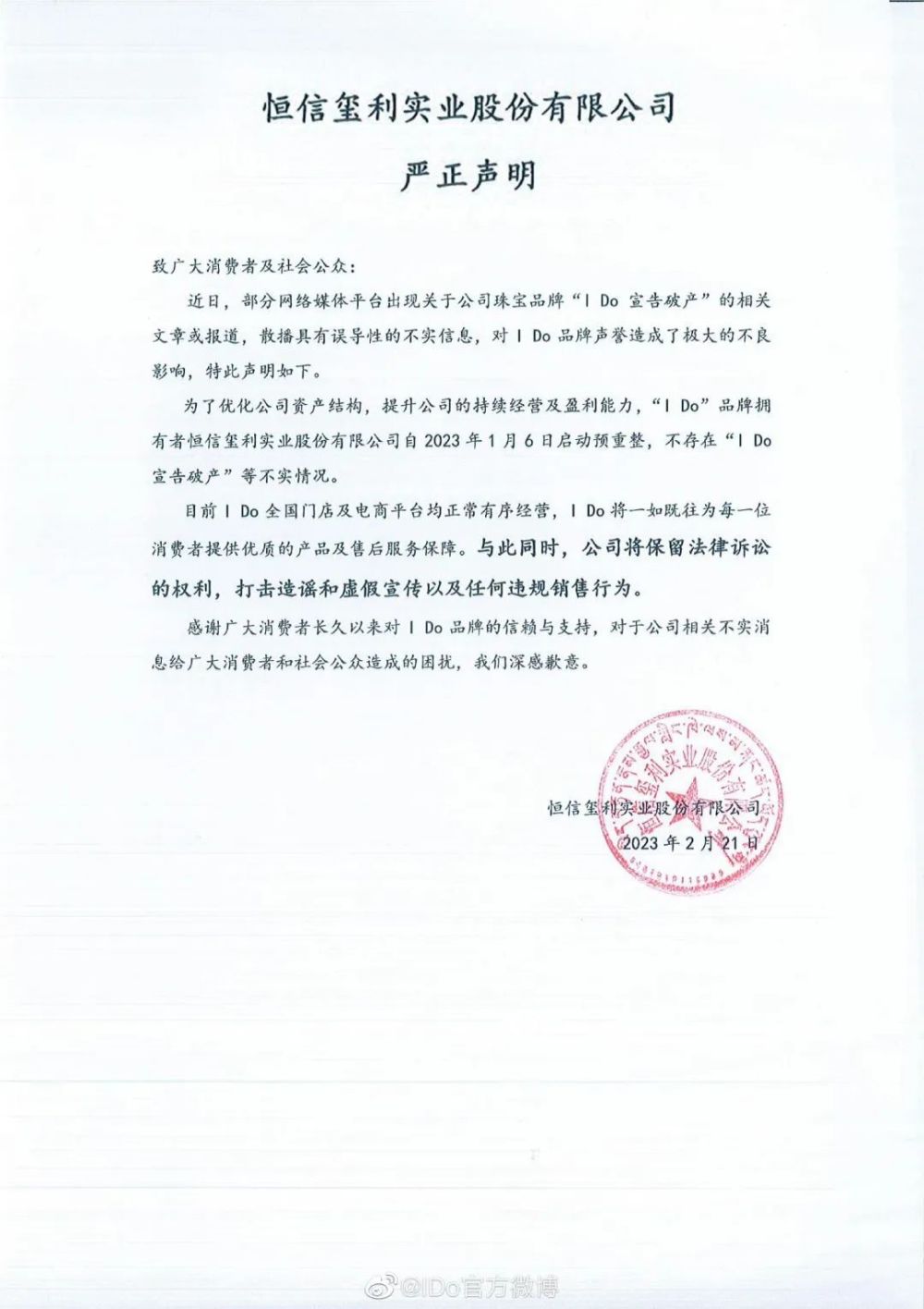 随后,对于“破产”传闻,@IDo官方微博 发布《恒信玺利实业股份有限公司 严正声明》回应。