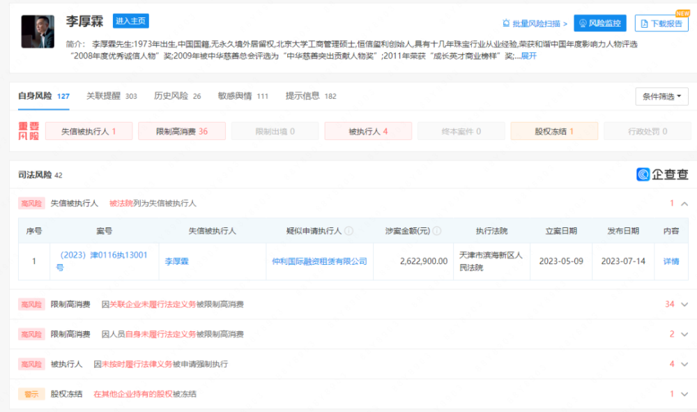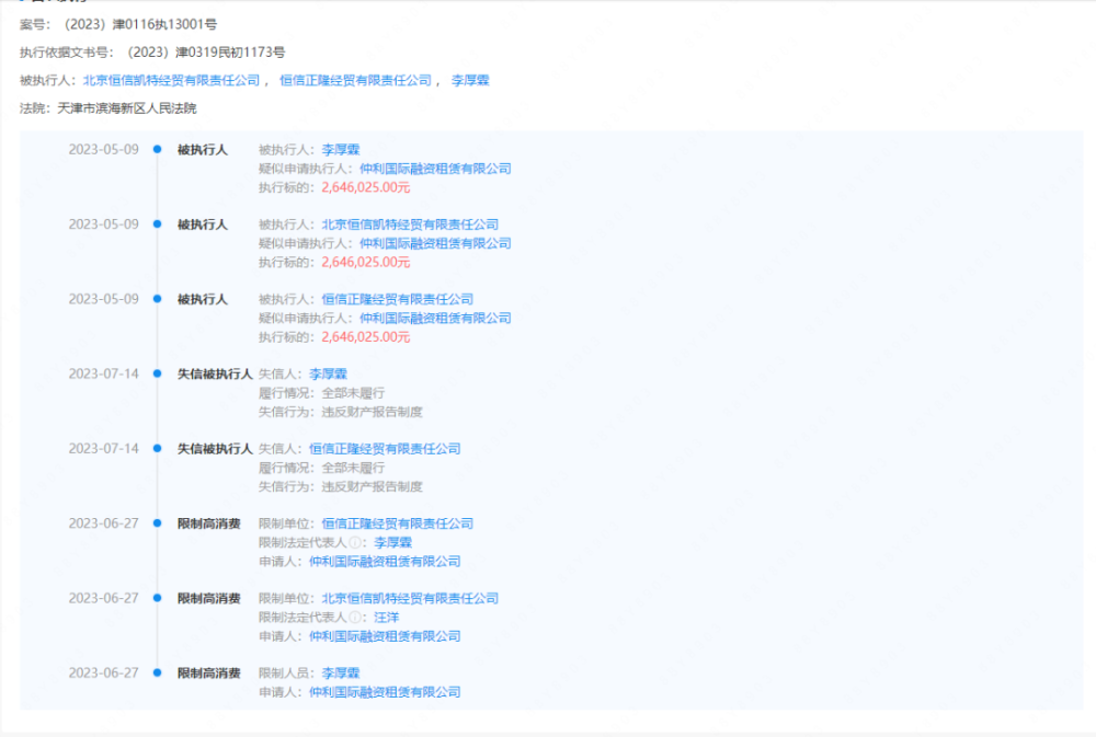 6月27日,由于李厚霖未在指定时间内履行给付义务,被天津市滨海新区人民法院限制高消费。