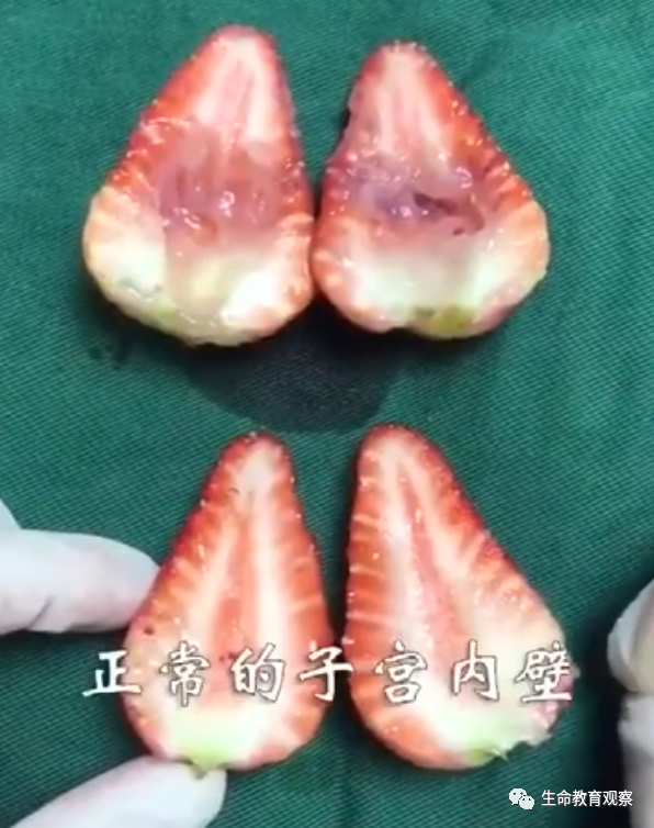 国家人口计生委科学技术研究所公布的数据显示,中国每年人工流产1300万人次,大约每2.4秒就有1名女性躺上人工流产的手术台。她们的年龄,从十几岁到四十几岁不等。有些人觉得“无痛人流”只是个小手术,对身体影响不大。鹤岗人民医院外科医生王野虓用草莓“演示”人流过程,上图是人流后的子宫,下图是健康的子宫。