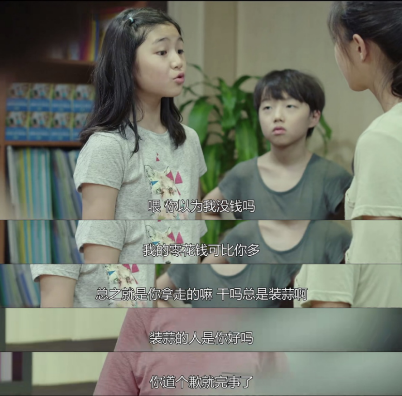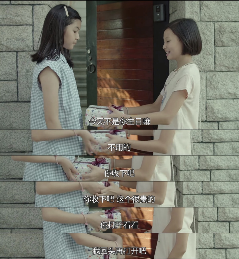 虽然李善争取到了与智雅同桌的机会,但智雅却跟以宝拉为首的小团体关系越来越好。几个人经常围坐在智雅的座位旁,聊得热火朝天。可一见到李善,又都立刻“默契”地噤声,回到各自的座位上。通过她们的讨论,李善得知马上就是智雅的生日了。或许是为了抓住这最后一根稻草,一向乖巧懂事的李善,竟然偷拿了妈妈的钱,买了一件昂贵的礼物想要送给智雅。但当智雅见到抱着礼物的李善时,脸上的表情却是心虚多过了惊喜。