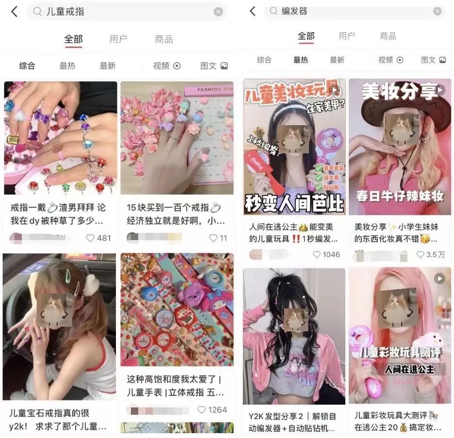 美妆博主们还开始研究小学生的彩妆玩具——化妆品、美甲贴纸、头发镶钻器、自动编发器、彩条编发器……
