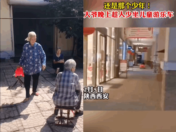 还有大爷趁着晚上人少玩儿童游乐车,一堆大娘聚在一起玩童年游戏“丢手绢”……