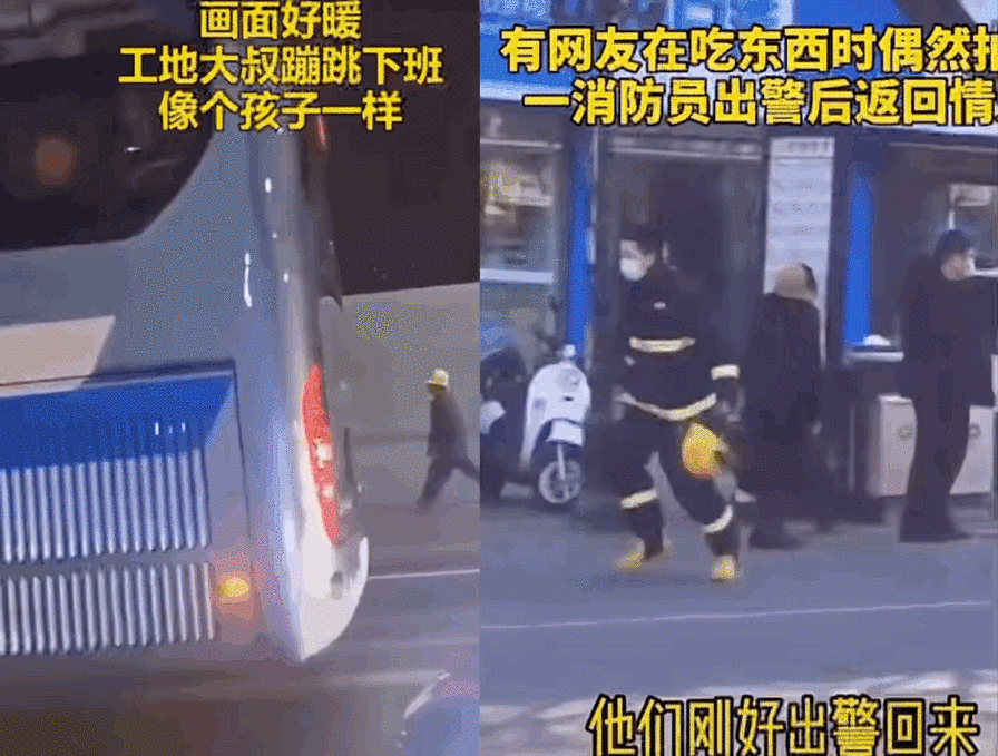 蹦蹦跳跳下班回家的建筑工人大叔、回驻地的消防员“蓝朋友”;