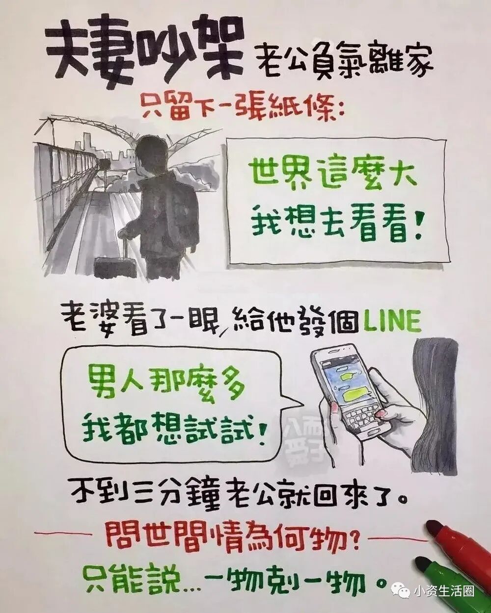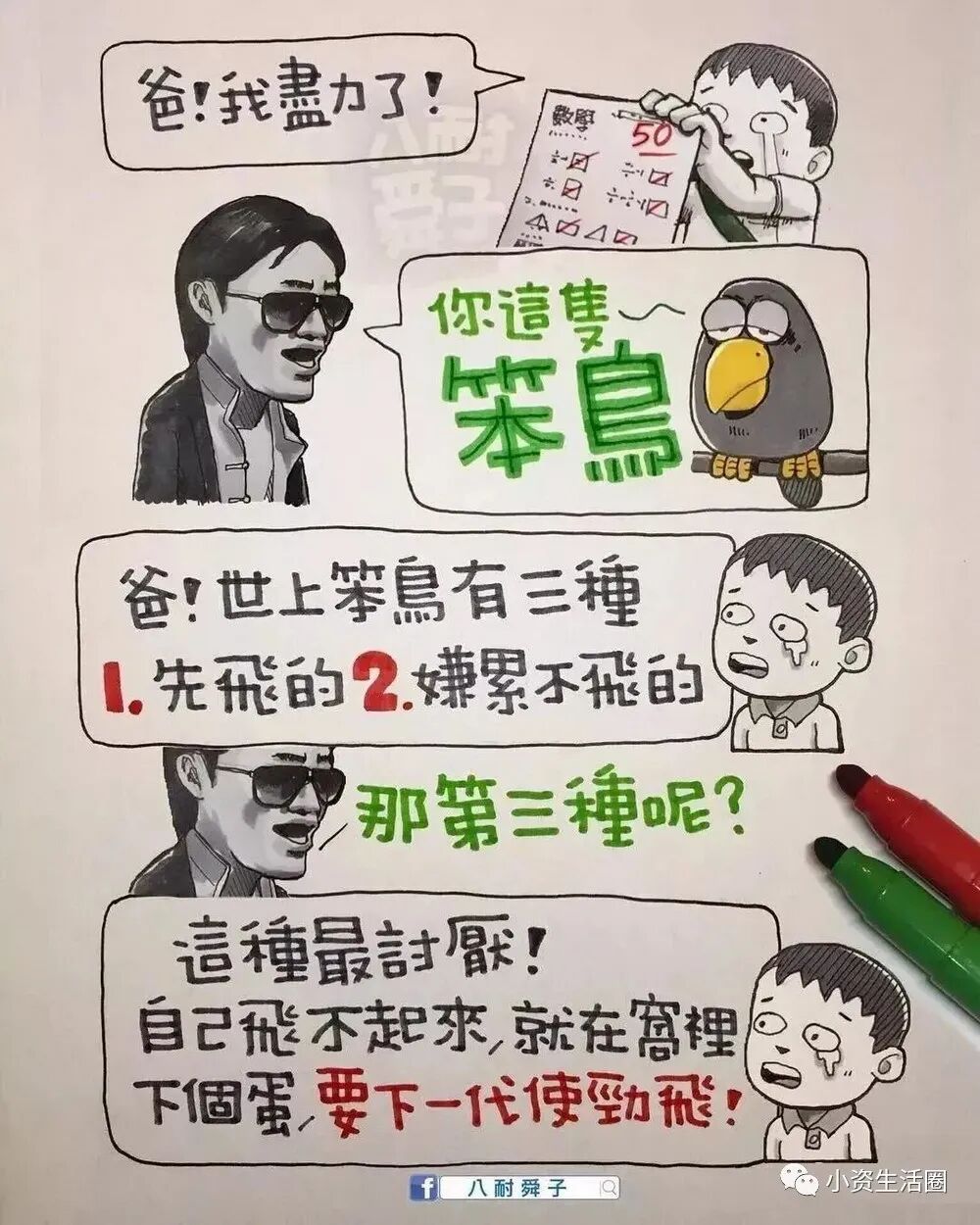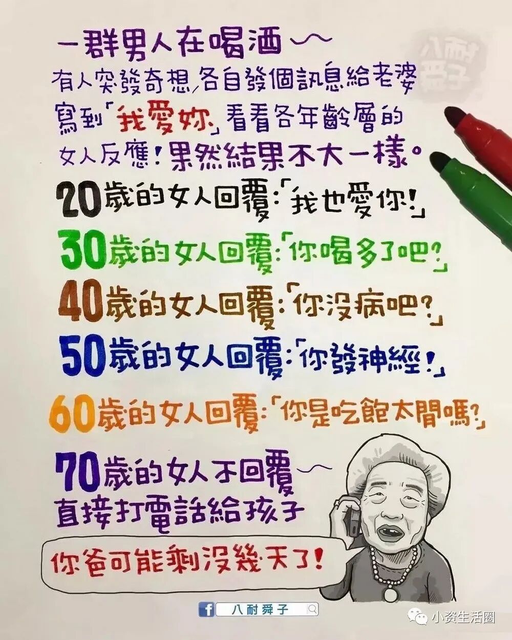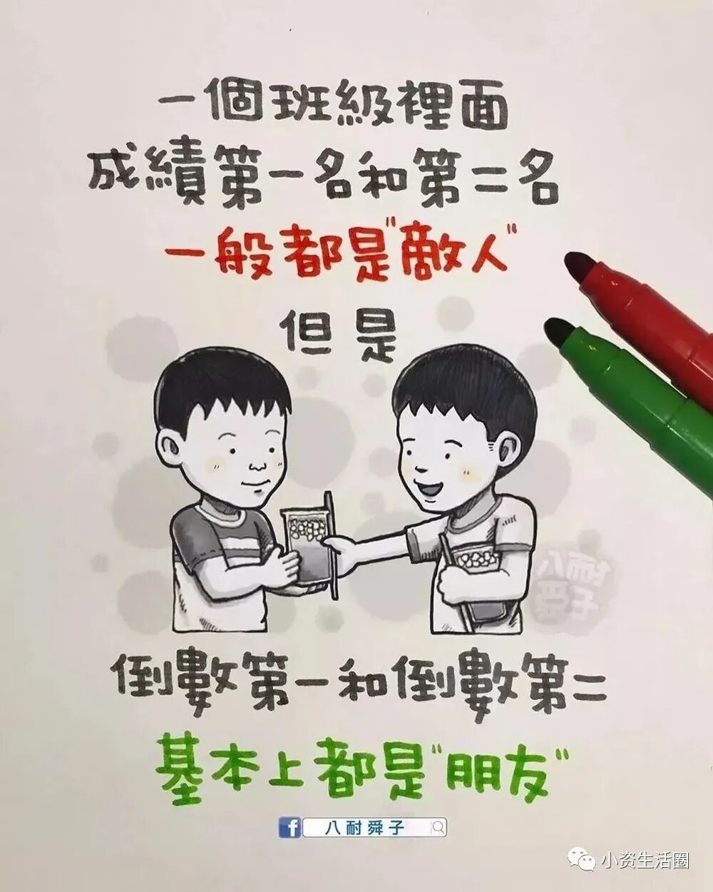 阅读本文前,请您先点击上面的“蓝色小字”,再点击“关注”,这样您就可以继续免费收到最新文章了。每天都有好看的图文、视频。与您共赏~百万人追随的八耐舜子,老婆是他的天!台湾漫画家“八耐舜子”,非常善在幽默中揭露成年人的现实生活!一页纸一幅图几句话,即让一个个人生道理顿时跃入眼帘。他说:“ 喜乐的心,乃是良药 。”如此达观的人,定会有惊世的漫画。在此特别精选他的40幅手绘作品,一起来细品蕴含其中的,成年人的辛酸和悲喜!