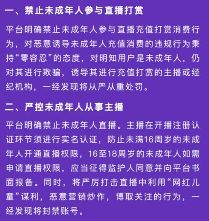 不仅仅是禁止直播打赏,未成年人从事主播也严控。