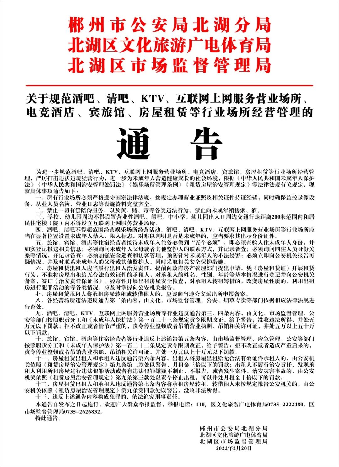 为进一步规范酒吧、清吧、KTV、互联网上网服务营业场所、电竞酒店、宾旅馆、房屋租赁等行业场所经营管理,严厉打击违法违规经营行为,进一步为未成年人营造健康成长的社余环境。根据《中华人民共和国未成年人保护法》《中华人民共和国治安管理处罚法》《娱乐场所管理条例》《租赁房屋治安管理规定》等法律法规有关规定,现就具体事项通告如下: