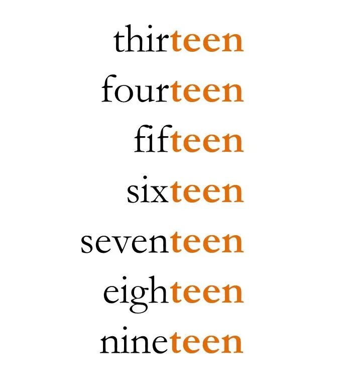 英语中的数字,从1到12,在拼写和读音上都没有固定规律,例如one, two, three… twelve;但是,从13开始直到19,这7个数字的词尾都是-teen,例如 thirteen, fourteen…, nineteen 等等。