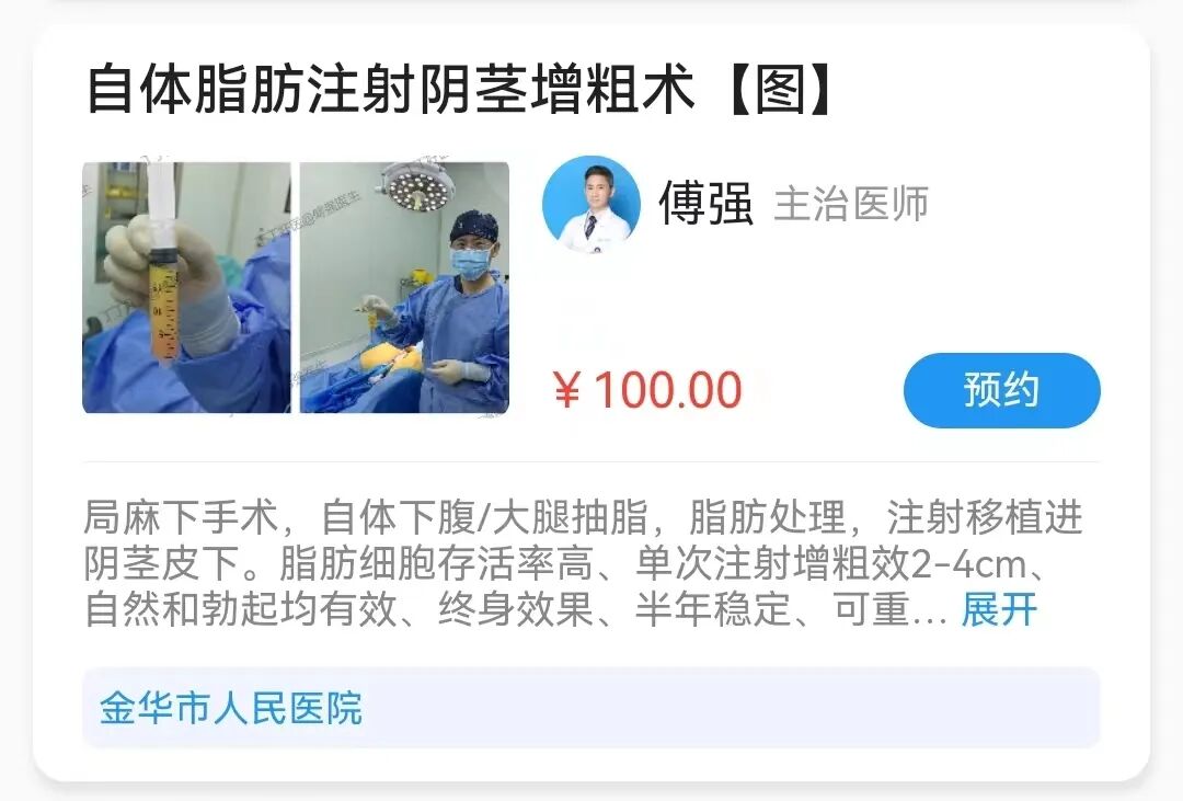 傅强医生已为丁丁好医平台全国范围数百位丁友做过包皮手术和阴茎整形手术,现在受聘到浙江省金华市人民医院出诊,开展男性生殖整形专科门诊,全国的患者都可以到预约其手术。