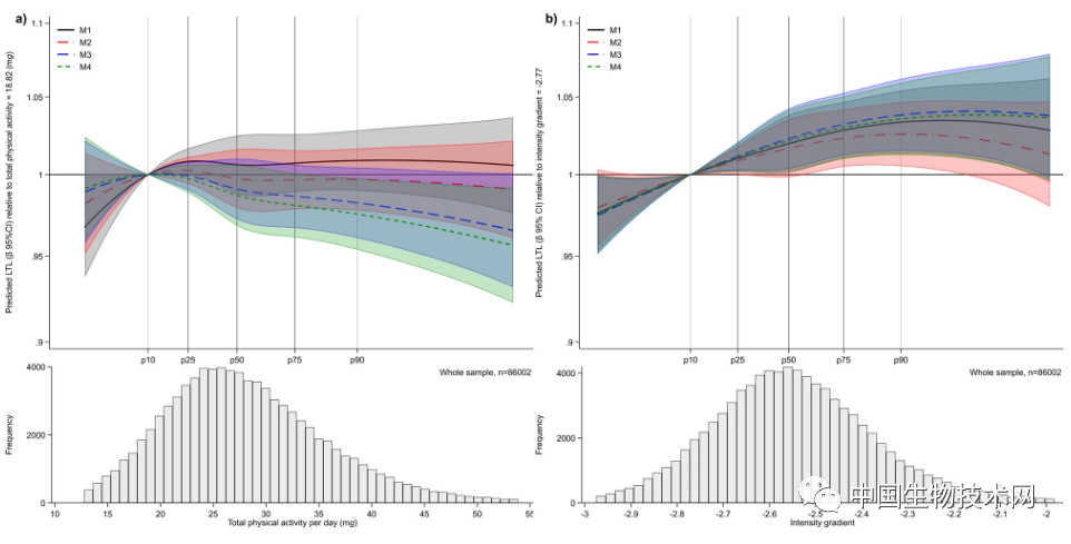 因此,端粒长度与习惯性的活动强度有关,与活动总量无关。重要的是,随后的双向孟德尔随机化分析表明步行速度与端粒长度之间存在因果关系,即更快的步行速度可能与更长的端粒长度有关,反之则不成立。慢速步行者与快速步行者之间的端粒长度差异相当于16岁的生物年龄差异。