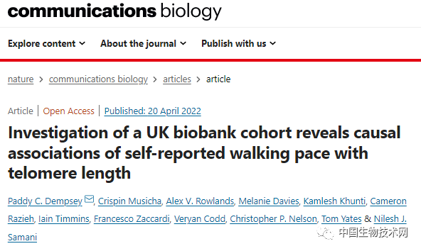 本文转载自中国生物技术网常言道:人老腿先老。由于人体三分之二的肌肉都集中在下肢。因此,六十多岁的人可以有年轻人七成的握力和臂力,但腿部的力量却只剩下四成。不过,大家也别担心。大量研究发现,任何形式的运动都比久坐要好太多,尤其像走路这种适合于每个人的活动,它不仅不用花钱、强身健体,而且,还可能走得越快,人越年轻。近期发表在Nature子刊《通讯·生物学》(Communications Biology)上的一项最新研究中,来自英国莱斯特大学领导的研究团队基于超过40万成年人的遗传数据,首次在步行速度与生物年龄遗传标志物之间建立了因果关系。该研究表明,步行速度与端粒长度之间存在因果关系,步行速度快的人,端粒更长。一生中走路快的人,中年的时候,生物学年龄年轻16岁。