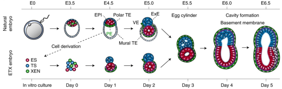 天然胚胎和干细胞培养胚胎的自组织和形态转变示意图。红色:天然胚胎的上胚层和体外培养胚胎的胚胎干细胞(ES)。蓝色:天然胚胎中的滋养外胚层和体外培养胚胎中的滋养层干细胞(TS)。绿色:自然胚胎中的原始内胚层和内脏内胚层,以及体外培养胚胎中的胚外内胚层细胞(XEN)。紫色:中胚层。ExE,胚外外胚层。