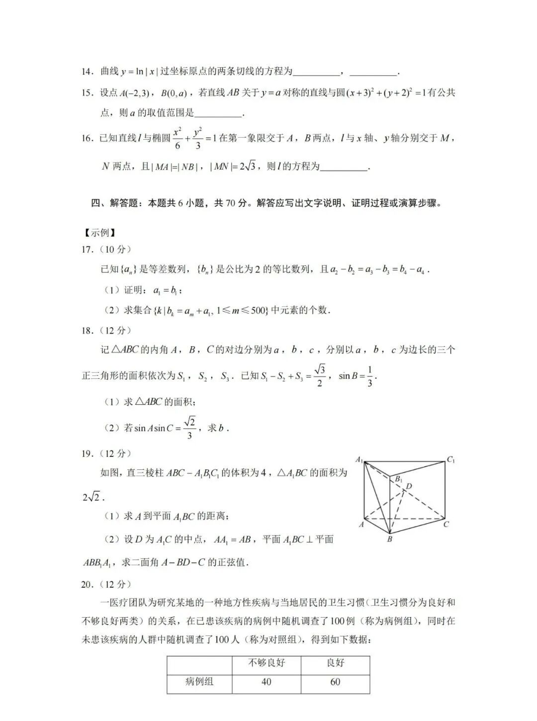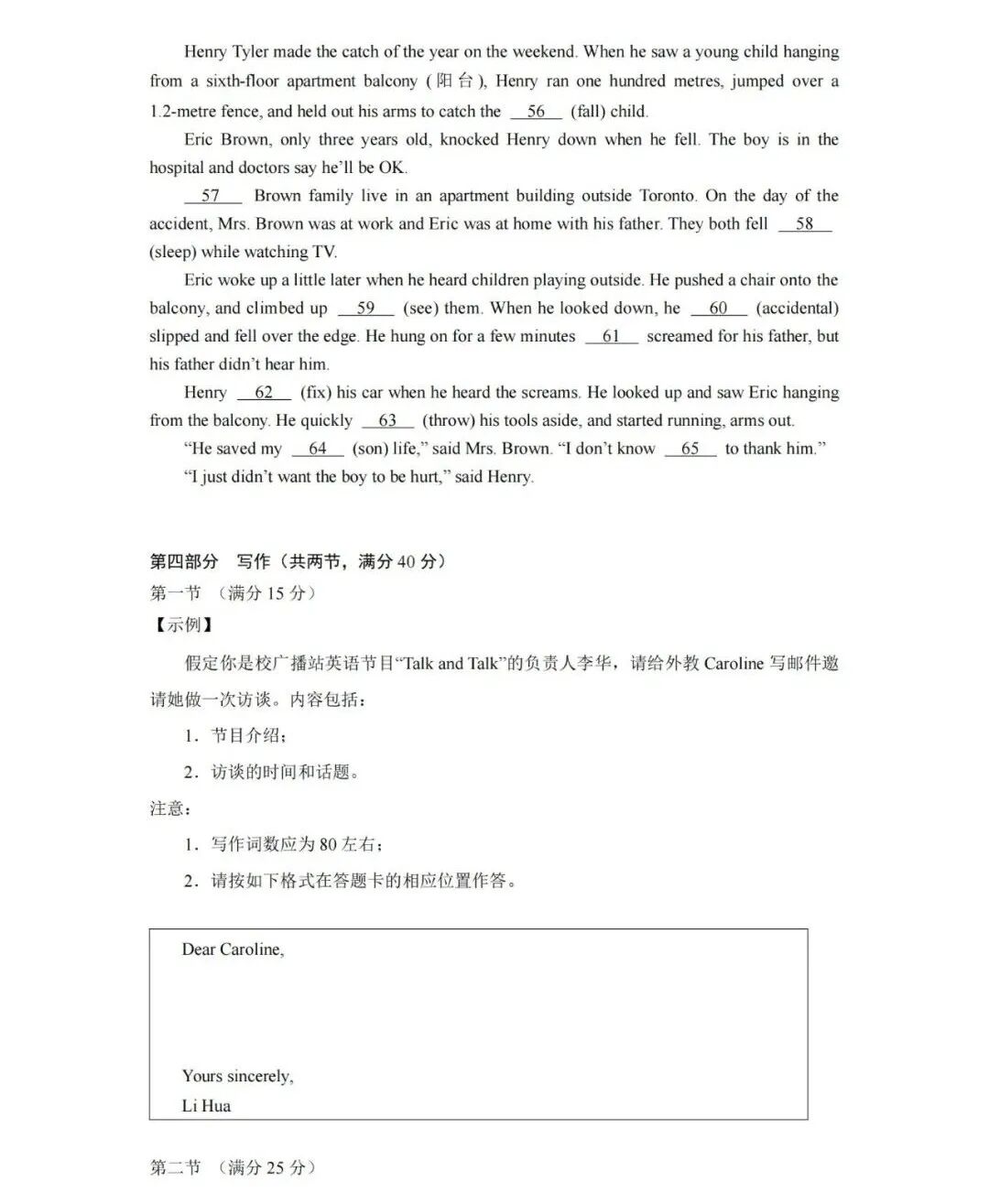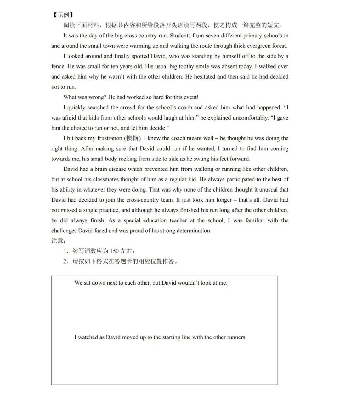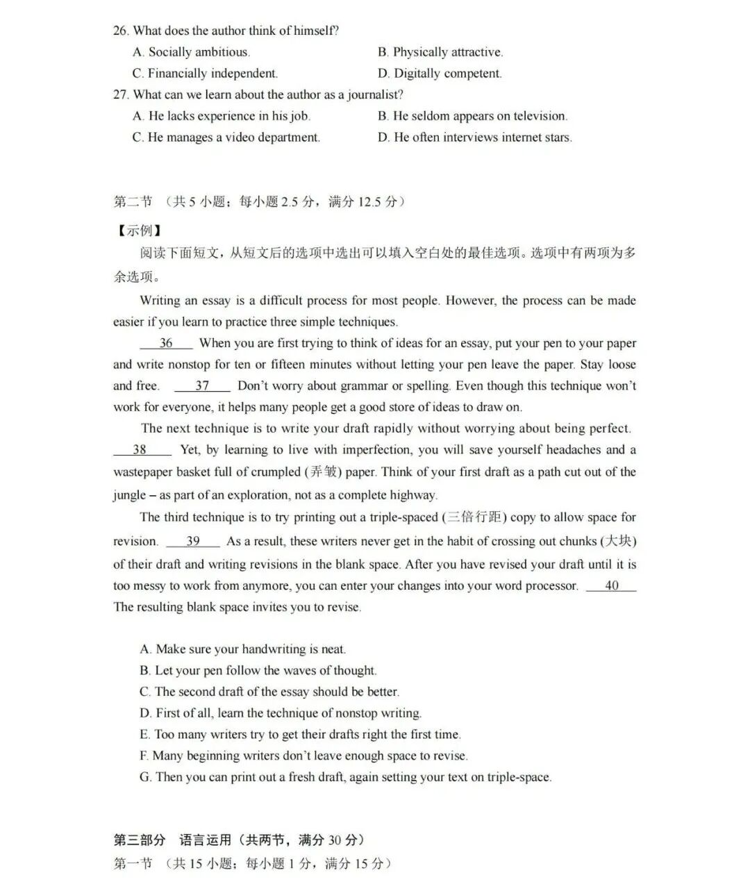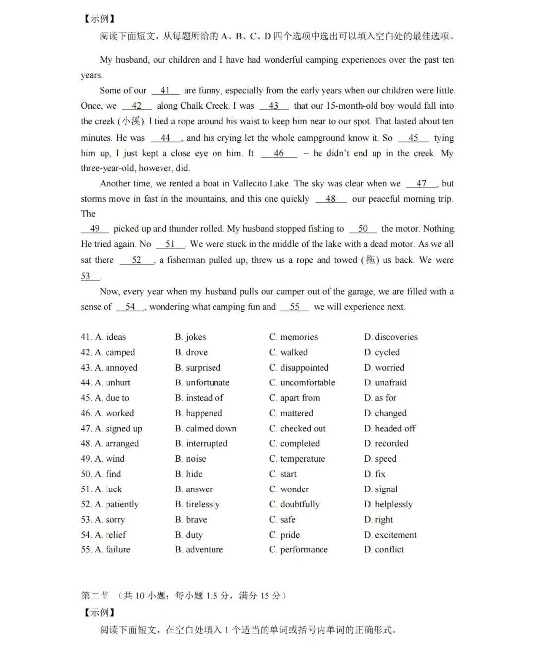 (节选自《东观汉记》卷十)10.文中画波浪线的部分有两处需加句读,请用铅笔将答题卡上相应位置的答案标号涂黑。吴A汉B为C人D质E厚F少G文H造I次J不K能L以M辞N语O自P达Q邓R禹S及T诸U将V多W所X荐Y举11.下列对文中加点的词语及相关内容的解说,不正确的一项是A.衔枚指在口中横衔着枚,枚的形状像筷子,是古代行军时用以禁止喧哗的器具。B.差强人意,文中指表现较差、不能令人满意,后来的意思转变为勉强令人满意。C.尊重,文中是尊贵、显要的意思,现在一般表示敬重、重视,二者的意思不同。D.车驾,文中以帝王所乘车马代指帝王,与古诗文中“丝竹”代指音乐用法相同。12.下列对原文有关内容的概述,不正确的一项是A.邓禹向皇上推荐吴汉承担调发幽州军队的任务,皇上命吴汉为大将军,吴汉斩幽州牧苗曾,完成使命,皇上赞赏邓禹有知人之明。B.吴汉伐蜀,在水南水北分设大营,北营不利,合兵南营,大破公孙述,但后来被延岑袭击后方,吴汉落水,拉着马尾才得以脱险。C.吴汉为人质朴,忠心耿耿,深得皇上的信任。他跟着皇上征伐四方时,常常随从左右,小心侍卫,总是等到皇上安歇后才退出去。D.吴汉处世俭朴,恭敬谨慎,不置田产,不起巷第。他出征在外时,家人曾置买一些田产宅业,他归来后全部都分送给了故旧部属。13.把文中画横线的句子翻译成现代汉语。(1)禹曰:“吴汉可。禹数与语,其人勇鸷有智谋,诸将鲜能及者。”(2)汉还,让之曰:“军师在外,吏士不足,何多买田宅乎!”14.《后汉书·吴汉传论》用孔子的“刚毅木讷近仁”一语来赞誉吴汉,请简要概述吴汉的刚毅与木讷之处。(二)古代诗歌阅读(本题共2小题)【示例1】阅读下面这首宋词,完成15~16题。醉落魄·人日南山约应提刑懋之[注] 魏了翁无边春色。人情苦向南山觅。村村箫鼓家家笛。祈麦祈蚕,来趁元正七。 翁前子后孙扶掖。商行贾坐农耕织。须知此意无今昔。会得为人,日日是人日。[注]人日:旧俗以农历正月初七日为人日。15.下列对这首词的理解和赏析,不正确的一项是A.词人在人日约朋友去南山探春,但因年老体弱,感到此行会比较困难。B.在人日这天吹打奏乐,祈盼农桑丰收,反映了人们对美好生活的追求。C.这首词以朴实的笔触描绘当时农村的风俗景况,具有浓郁的生活气息。D.词人以议论入词,能够做到情由境出,情至论随,全词并无生硬之感。16.词人在下阕发表议论,指出如果懂得做人的道理,每天都是人日。词中谈到哪些做人的道理?请结合内容简要分析。【示例2】阅读下面这首唐诗,完成15~16题。发临洮将赴北庭留别① 岑参闻说轮台路②,连年见雪飞。春风不曾到,汉使亦应稀。白草通疏勒,青山过武威。勤王敢道远,私向梦中归。[注]①临洮:在今甘肃临潭西。北庭:唐六都护府之一,治所为庭州(今新疆吉木萨尔北)。②轮台:庭州属县,在今新疆乌鲁木齐。15.与《白雪歌送武判官归京》相比,本诗描写塞外景物的角度有何不同?请简要分析。16.诗的尾联表达了作者什么样的思想感情?对全诗的情感抒发有怎样的作用?(三)名篇名句默写(本题共1小题)【示例1】17.补写出下列句子中的空缺部分。(1)鲍照《拟行路难》(其四)以“ , ”两句起兴,由平凡的日常生活现象引发感慨。(2)曹操《短歌行》中表示希望尽可能多地接纳人才的名句“ , ”,由仿写《管子》中的“海不辞水,故能成其大;山不辞土石,故能成其高”而来。(3)李白对谢灵运十分推崇,常常在诗中称他为“谢公”,如“ , ”。三、语言文字运用(20分左右)(一)语言文字运用I【示例1】阅读下面的文字,完成18~20题。