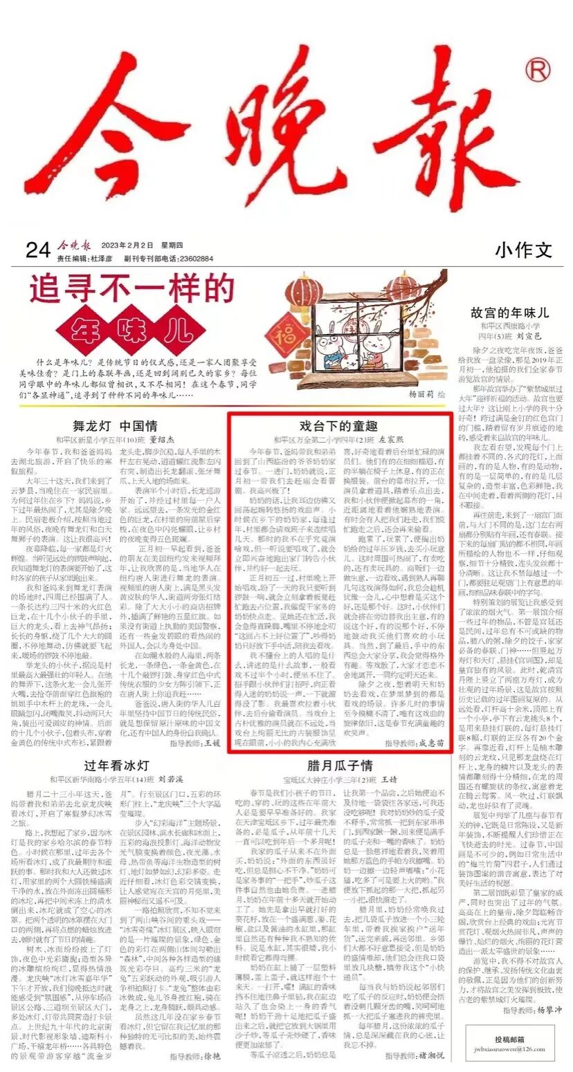 2月2日,我校四年二班左宸熙同学的习作《戏台下的童趣》荣登在《今晚报》小作文“追寻不一样的年味儿”专题版面中。左宸熙同学将自己对晋剧的感受用文字记录下来,写成了这篇作文。我们一起去看看吧!