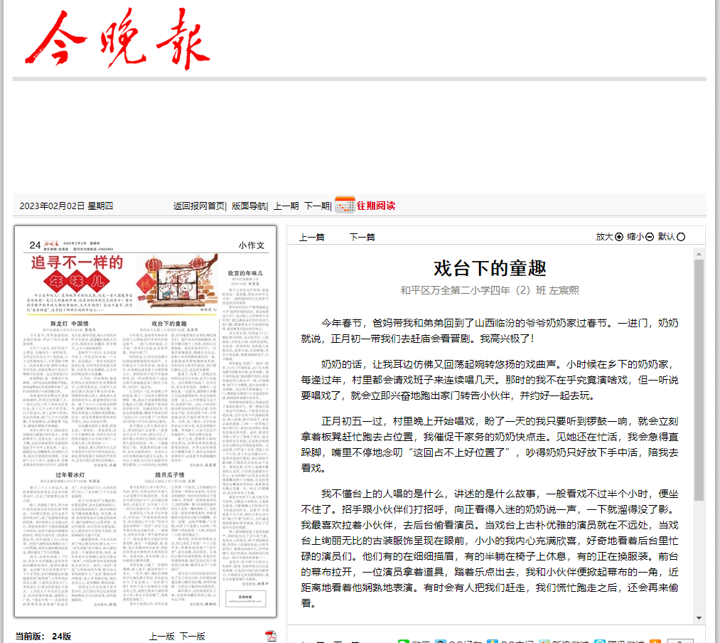 手机访问:wap.265xx.com【小荷初绽】“欢乐过大年,戏台大童趣”——《今晚报》“小作文”专栏刊登万全第二小