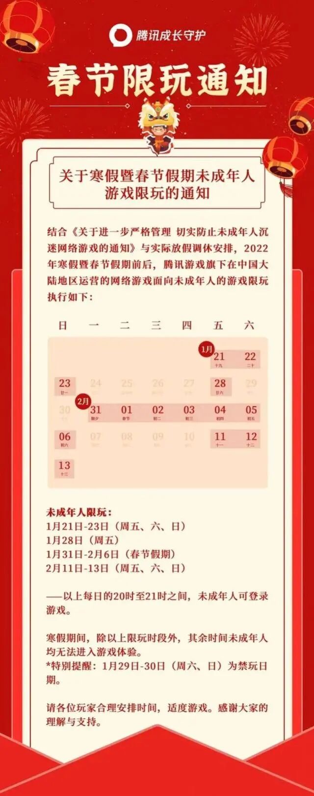 近日,腾讯游戏发布了“寒假限玩日历”,公布2022年寒假暨春节假期未成年人限玩时间。