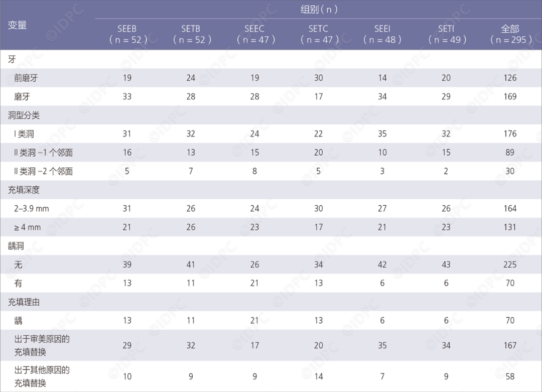 在窝洞的预备过程中,由于牙髓暴露,12颗牙齿必须从研究中排除,另外,因为受试者拒绝继续参与临床试验,有11颗牙齿被排除,因此,最终进行修复的牙齿数量为295颗,分布在图1所述的6个组中,这代表了参与本研究的患者数量。充填步骤完全按照最初计划执行。表2显示了受试者和制剂的详细信息。所有受试者在7天后都参与了回访。图1:研究设计不同阶段的受试者流程图。np = 受试者数量;n = 充填数量。