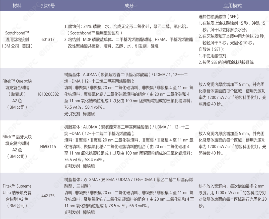 在筛选患者后,研究负责人对4名经过至少5年培训、已被认证为口腔修复专家的操作人员进行相关操作指导,并由他们进行龋洞测量并执行所有修复操作。在开始充填修复之前,记录了每个患者的所有特征(性别和年龄)以及拟充填的牙齿(记录了牙齿类型、牙弓、窝洞类型、充填修复前是否存在自发敏感性、充填原因和充填面的数量)(表2)。表2:牙弓和窝洞的特征。