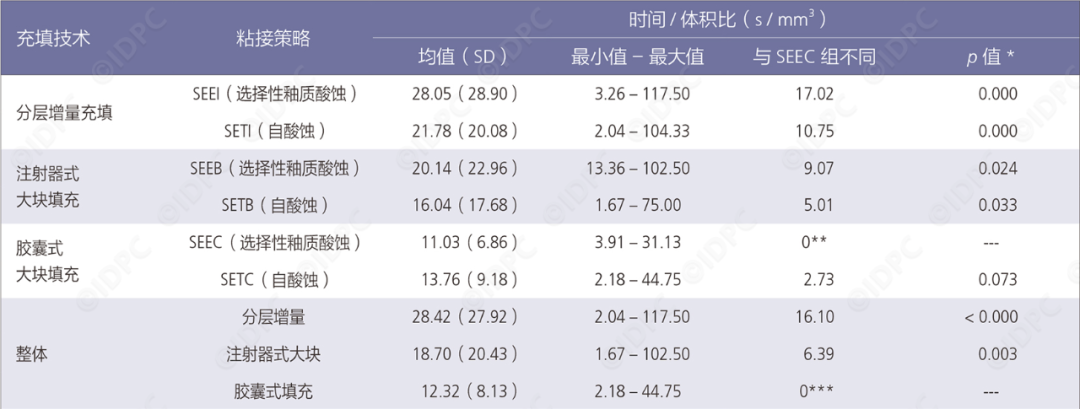表3显示,使用分层技术进行的充填修复平均比使用胶囊式大块填充进行的修复时间长16.10 s / mm3,并且显示使用注射器式大块填充进行的充填修复比使用胶囊式大块填充进行的修复长6.39 s / mm3。使用大块填充树脂或分层树脂修复体的时间/体积比在两种粘接方案之间没有显示出统计学上的显著差异。