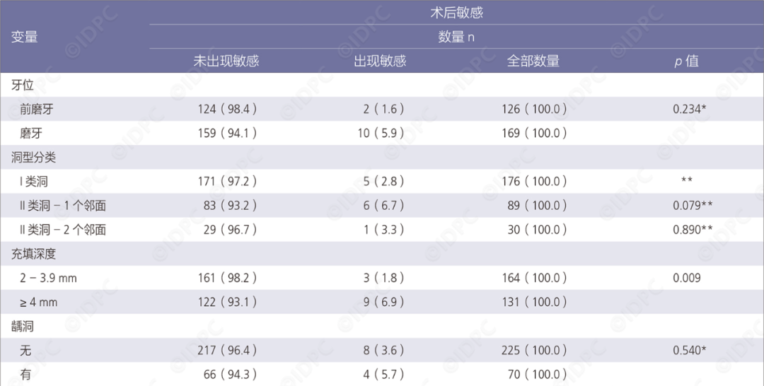* Wald卡方检验(p > 0.05);** I类洞和II类洞对比(1到2 个邻面)。