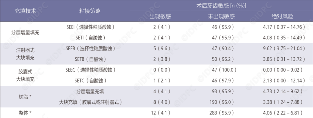 不考虑时间和评估量表,术后敏感性的总风险为4.06%(95%置信区间:2.22–6.81)。修复技术(分层填充vs大块填充)、呈现形式(注射器vs胶囊)和粘接方案(酸蚀和冲洗vs自酸蚀)均不影响术后敏感性风险(表4)。