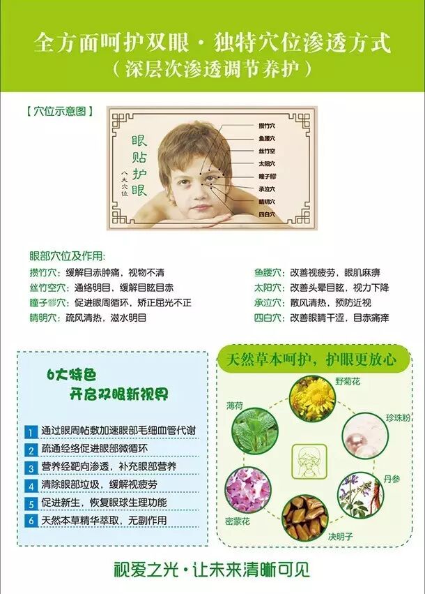 3.滋润眼部、缓解眼睛干燥:80%的电脑操作者有不同程度的眼干燥的感觉。严重的可引起眼球疼痛感,有的人甚至引起头痛、眩晕。视爱之光明目护眼贴针对眼周肌肤特点,滋润眼部、缓解眼睛干燥。