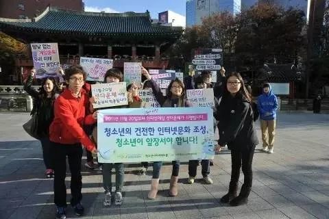 韩国青少年反游戏宵禁游行(图中标语:普及网络游戏文化)