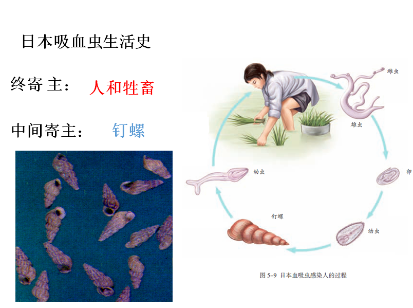 危害:血吸虫病,肝脾肿大、腹水、丧失劳动力,死亡