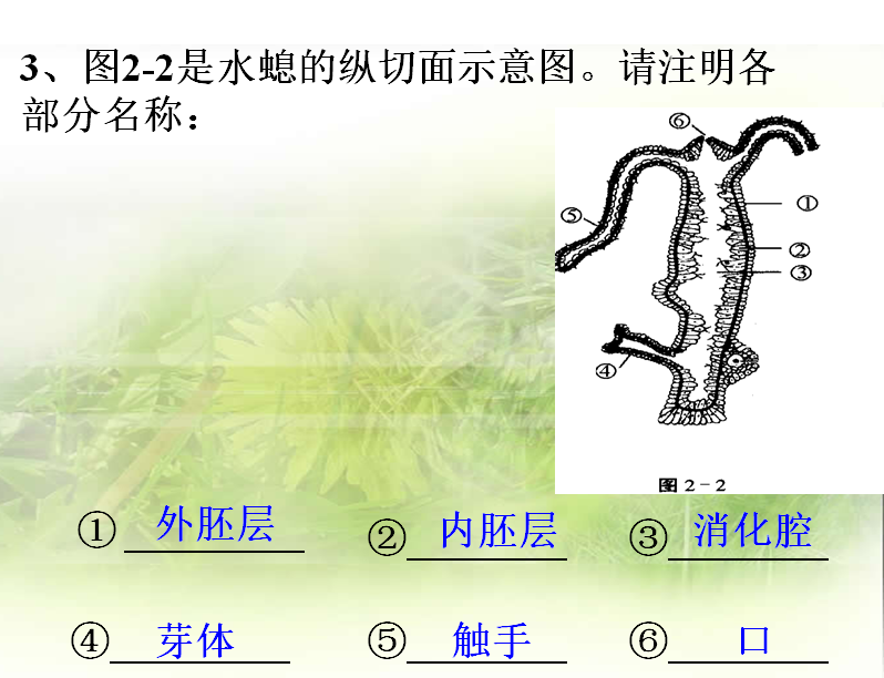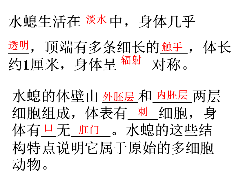 通过让学生总结水螅身体呈辐射对称。渗透生物的形太结构与生理功能是样适应的。