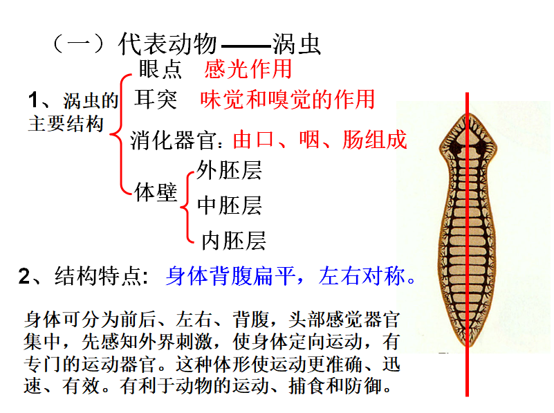 通过让学生总结涡虫身体呈两侧对称。渗透生物的形太结构与生理功能是样适应的。