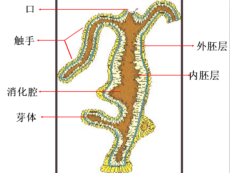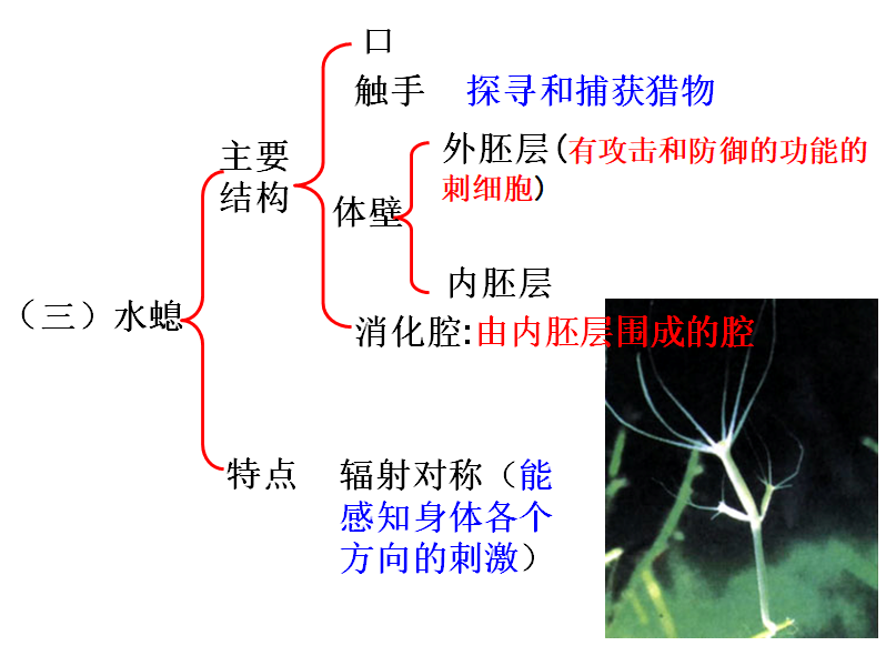 水螅身体由两层细胞组成-----内胚层和外胚层。内胚层围成的空腔叫做消化腔,消化腔与口相通。口周围有触手,适应固着生活;触手上有许多刺细胞,刺细胞里大多藏有毒液和刺丝。当遇到猎物或捕食者时,水螅能迅速弹出长而中空的刺丝,并将毒液通过刺丝注射到猎物或捕食者题内,从而将其麻醉或杀死