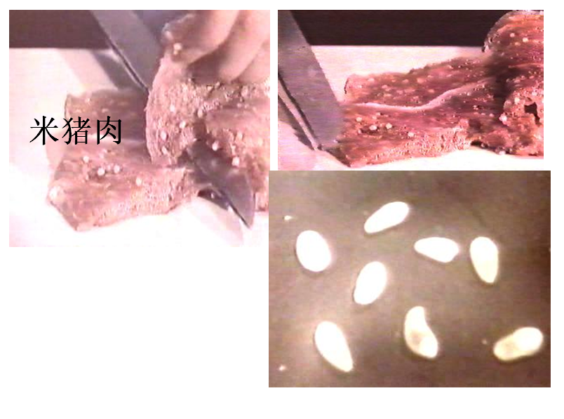 体长2-8m,700-1000个节片,头节有4个吸盘,顶突有小钩(2排,25-50个)。 人吃了未熟的含囊尾蚴的猪肉(米猪肉)后患病