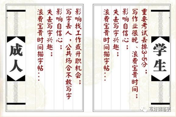 其实学写字是不分年龄的。不论是小学生还是成年人,学习写字都是对书写习惯的一种改变。同样是学写字,成年人的进步速度和学习效果是远远高于小学生的,因为成年人的观察比对能力和身心协调能力已经发育完善,远远胜于小学生。所以学习硬笔书法是不分年龄早晚,也没有定不定型的概念,成年人完全可以把字写好,而且能写出高水平的作品来。