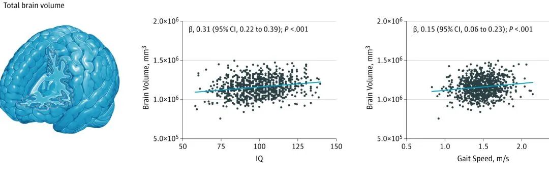 步行速度比较慢的人身体器官的衰老更加严重。肺部、牙齿、免疫系统的功能更差。他们的大脑健康程度也相对比较差,脑容量更小,皮质更薄,大脑表面积更小,认知功能下降得更多。