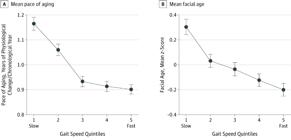 从统计意义上说,步行速度比较慢的人身体器官的衰老更加严重。肺部、牙齿、免疫系统的功能更差。他们的大脑健康程度也相对比较差,脑容量更小,皮质更薄,大脑表面积更小,认知功能下降更多。步态速度可能是从中年到老年生物机体衰老的汇总指标,而且可能起源于儿童中枢神经系统发育状况。这个结论有助于解释步态为什么可以成为老年时期失智失能和死亡风险的强指标。同时鼓励人们重新思考步态,步态不仅是一种运动问题,而且也是一种综合的健康衡量手段。