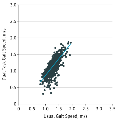 步行速度和认知能力参与者在45岁时的测试中,平均步行的速度为每秒1.30米。一边背诵一边走路的速度平均为每秒1.16米。一边背诵一边走路的速度测试是一种双任务测试。双任务测试往往用来评估一个人的认知能力。传统的理论认为,正常的行走和认知的关系不大,双任务行走才能更加准确地反映认知情况。令人惊讶的是,双任务行走和正常行走的速度有几乎完美的线性相关性。意味着正常行走速度和认知的关系比我们想象的更加密切。