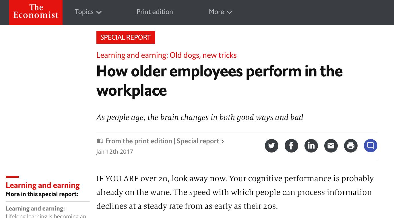 今年1月份《经济学人》刊出了有关终身学习的特别报道,其中有一篇谈到了大龄员工的学习问题。第一段就比较让人沮丧:20多岁开始,认知能力就开始走下坡路了。