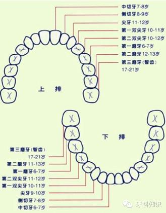 小孩子到了6岁就开始换牙了,有的是6岁半左右开始换牙(都是正常的),一直到12岁换牙结束。这个换出来的牙齿叫做恒牙,人一辈子就这一幅牙齿了,就不能再换了。恒牙有28或是32颗,在6岁左右开始萌出,到12岁左右全部萌出(不包括4颗智齿,也就是全部恒牙28颗)。(见下图)