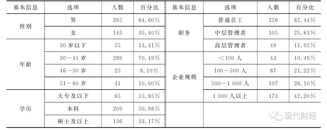 以京津冀地区和珠三角地区企业为样本,在京津冀地区发放问卷200份,在珠三角地区发放问卷300份,共计发放问卷500份,有效问卷回收410份,回收率达82%,符合相关研究要求,有效样本的特征分布情况如表1所示。