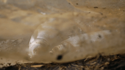 网里的小鱼拼命呼吸、放置在脏桶里的大鱼也奄奄一息。