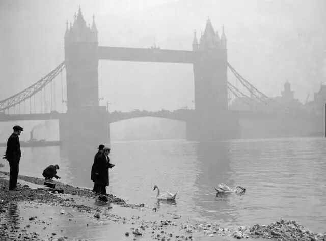 1928年10月,伦敦塔桥附近的泰晤士河边,几位市民在大雾天给天鹅喂食
